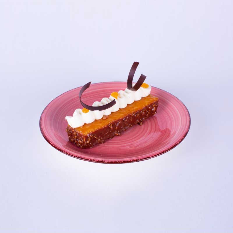 Biscuit Croustillant Praliné, Crémeux Passion, Confit Passion, Ganache montée Vanille Madagascar